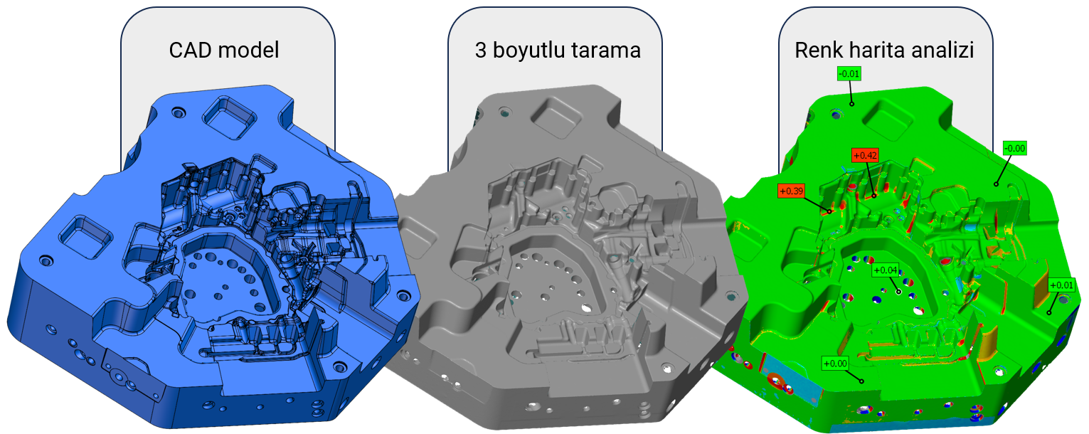 Bir kalıptan çıkan ilk numunenin ölçülüp raporlanması günler sürebilir. 3D tarama ile tüm parça yüzeyi bir saatten kısa sürede taranır ve CAD datası ile karşılaştırılarak sapma raporu anında oluşturulur. Bu, haftalar sürebilen kalıp deneme ve revizyon döngüsünü günler seviyesine indirir.